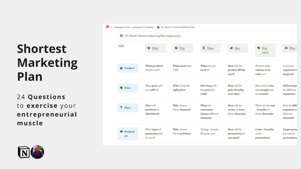 Exercise your entrepreneurial muscle with the 24-question Shortest Marketing Plan (interactive Notion template)